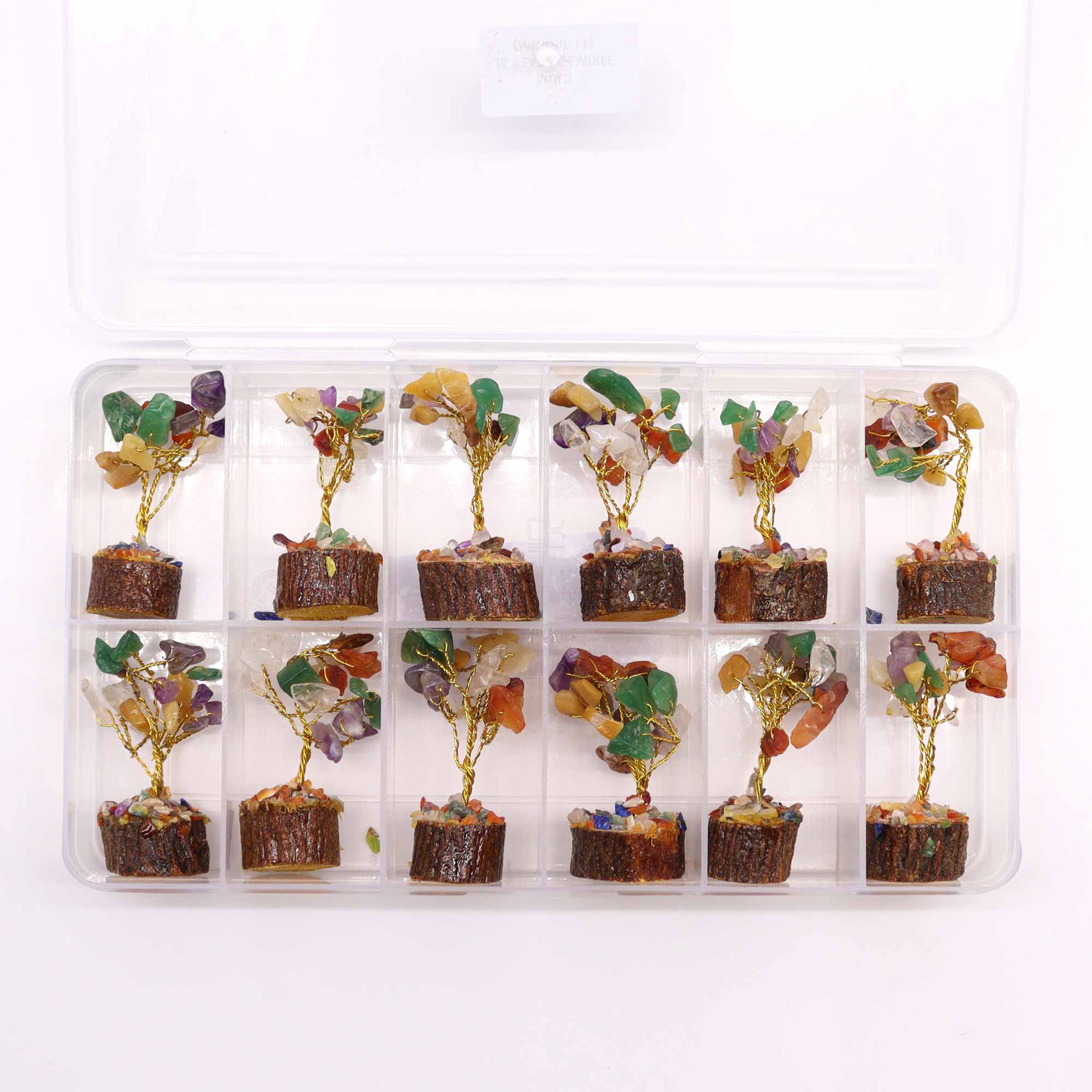 Products Details: – Wooden base – Adorned with 15 pieces of Multi Stone Gemstones – Each tree is approx. 6cm- Made and supplied by a long-standing supplier in IndiaThe plastic boxes these trees come in can be repurposed as collector’s display boxes or reused in creative ways.
